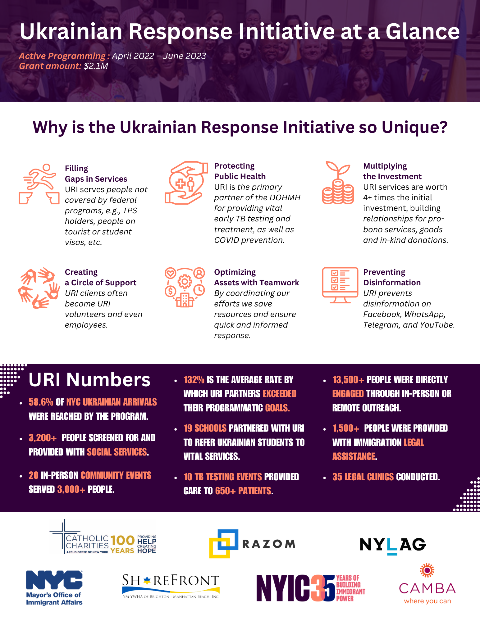 Previously, I directed humanitarian assistance and resettlement services for Ukrainian war survivors under the Ukrainian Response Initiative (URI). Working closely with the NYC Mayor’s Office of Immigrant Affairs, resettlement agencies, and community-based organizations, I ensured culturally and linguistically appropriate access to social and legal aid for newly arrived Ukrainians. View project outcomes here.